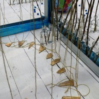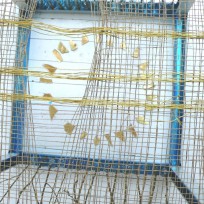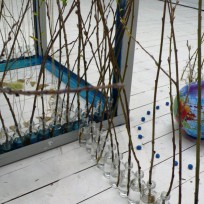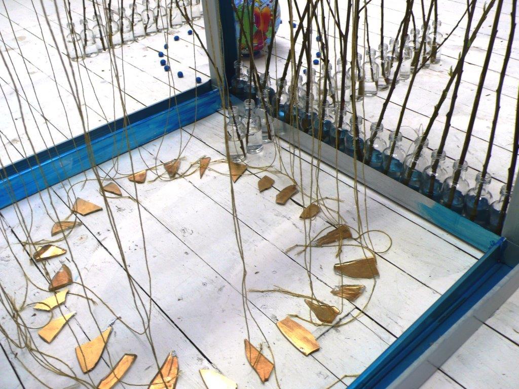 Painted aluminium cube-frame, hempstring, 24 glass splinters, 64 small bottles with willow-twigs, silk thread, playdough, ball with earthprint. 70 x 125 x 125 cm