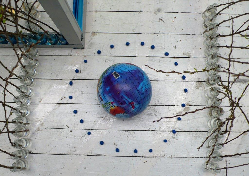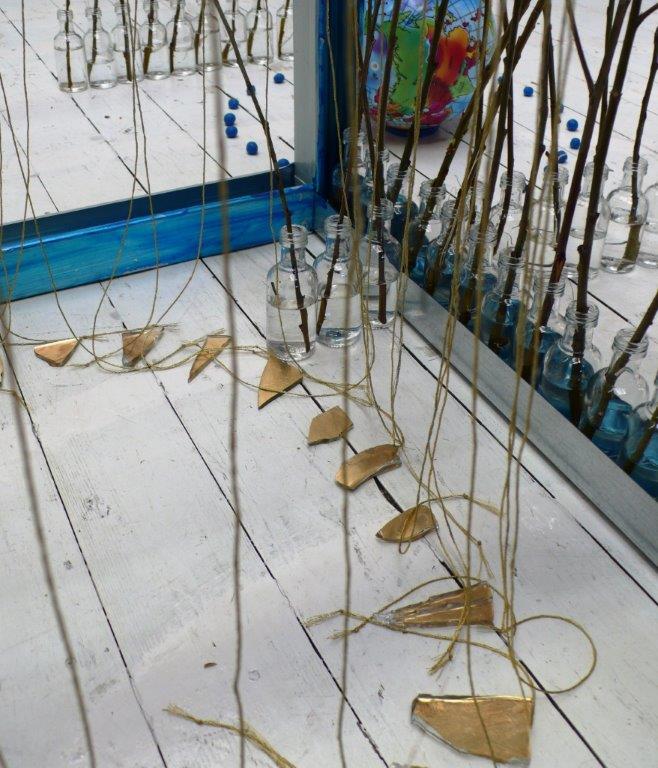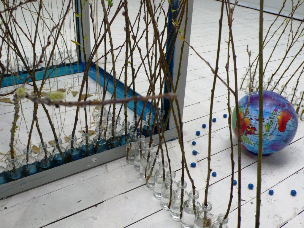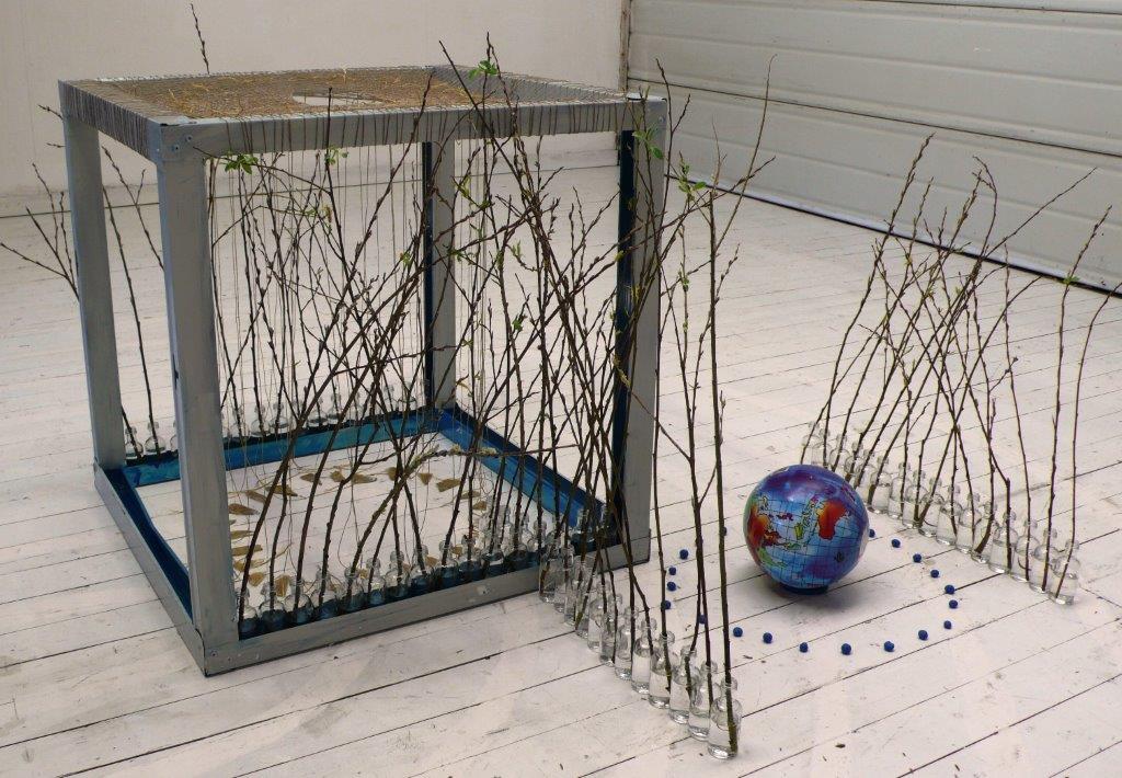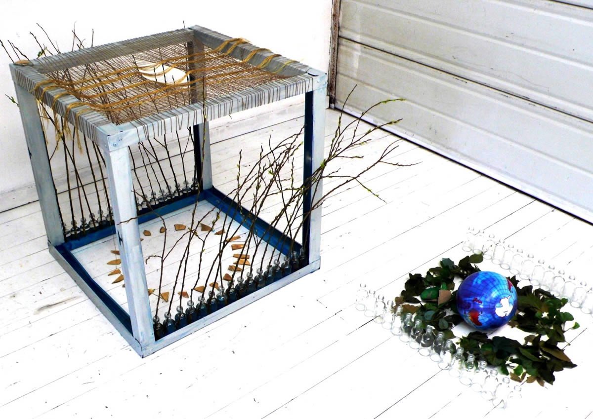 Geschilderd aluminium kubusframe, henneptouw, 24 glasscherven, 64 flesjes met wilgentwijgen, zijden draden, speelklei, bal met opdruk van aardbol 70 x 125 x 125 cm
