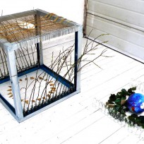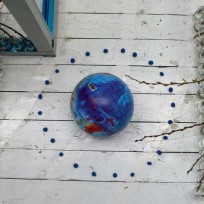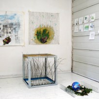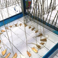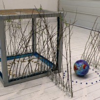 The stiff metal frame of the cube has doubled itself, into a protected inner world and a partly imaginary, vulnerable outer world. Organic additions split up the geometry: willow-twigs, growing leaves and roots; a circle of golden splinters and one of small blue dots; an irregular woven grid, and loose threads of golden silk. And then also a perfect sphere, excentric, mostly blue, hardly protected.