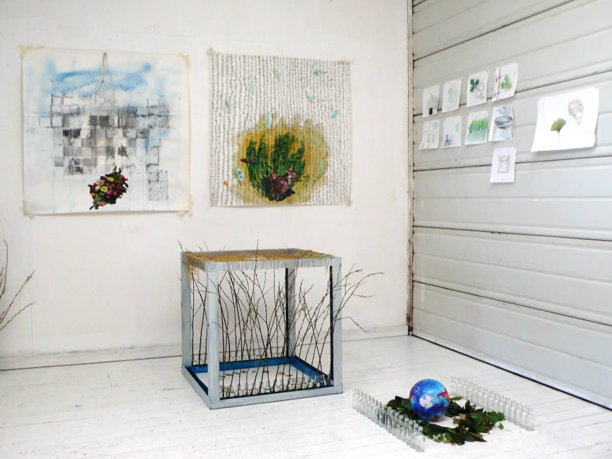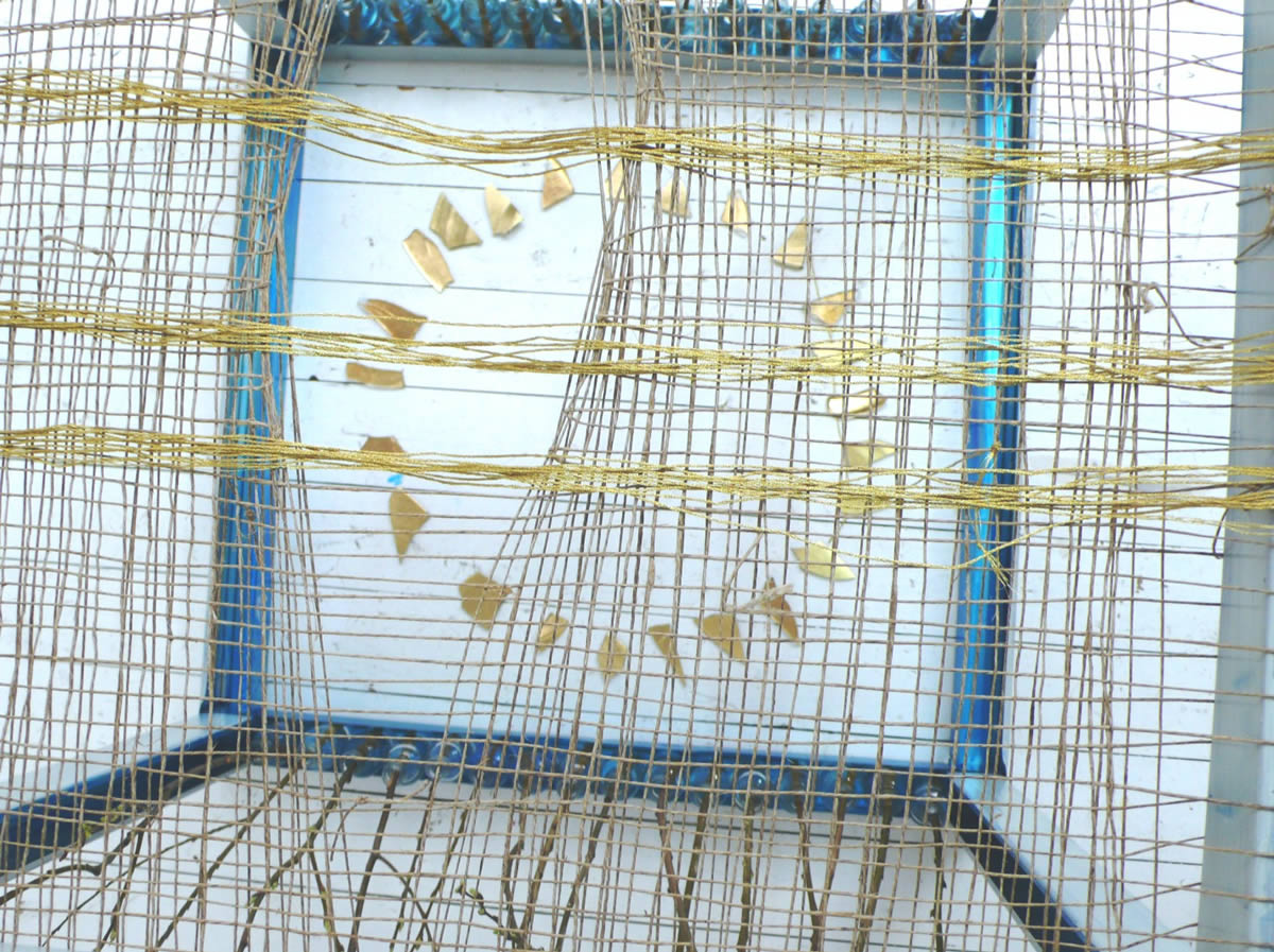 Het strakke metalen kubusframe heeft zich verdubbeld, gesplitst in een beschermde binnenwereld en een deels imaginaire, kwetsbare buitenwereld. Organische toevoegingen doorbreken de geometrie: wilgetwijgen met uitlopend blad en wortels; een cirkel van gouden scherven en een van blauwe stipjes; een weefsel dat een onregelmatig grid vormt, en loshangende draden van goudkleurige zijde. En dan nog een perfecte bol, excentrisch, grotendeels blauw, nauwelijks beschermd.