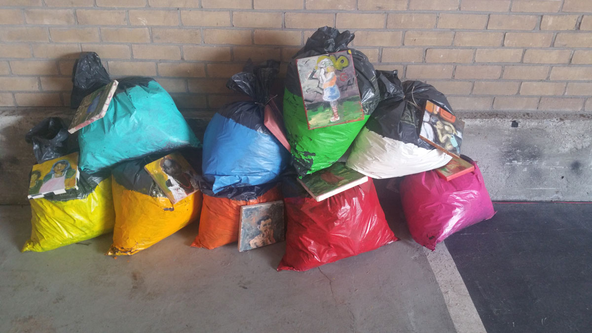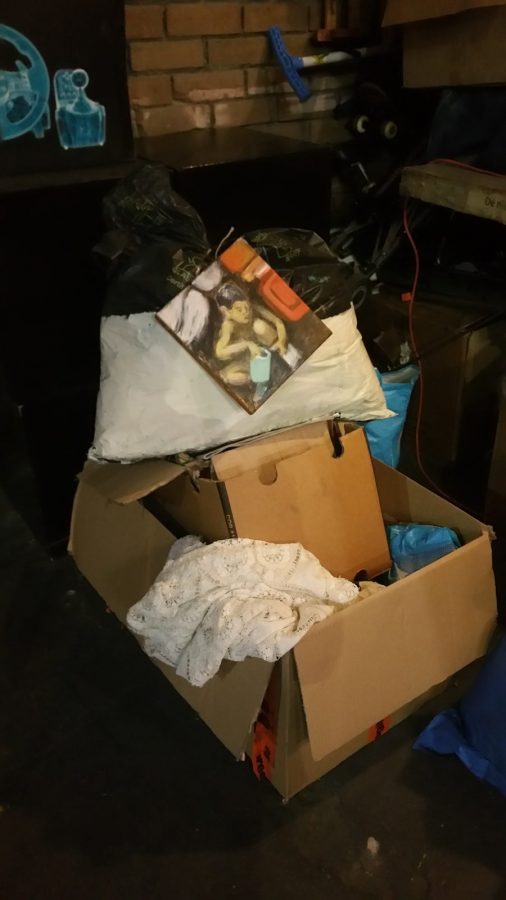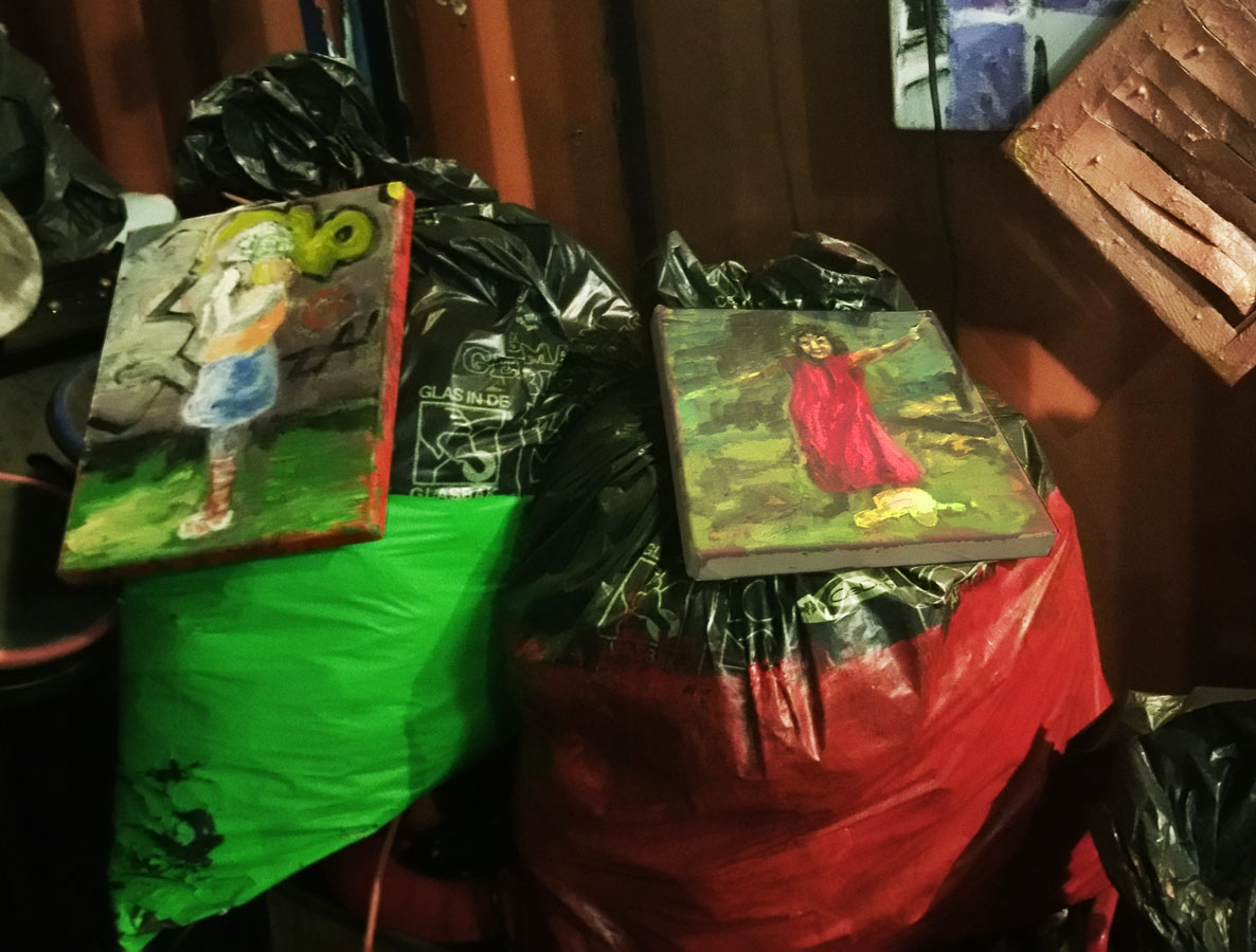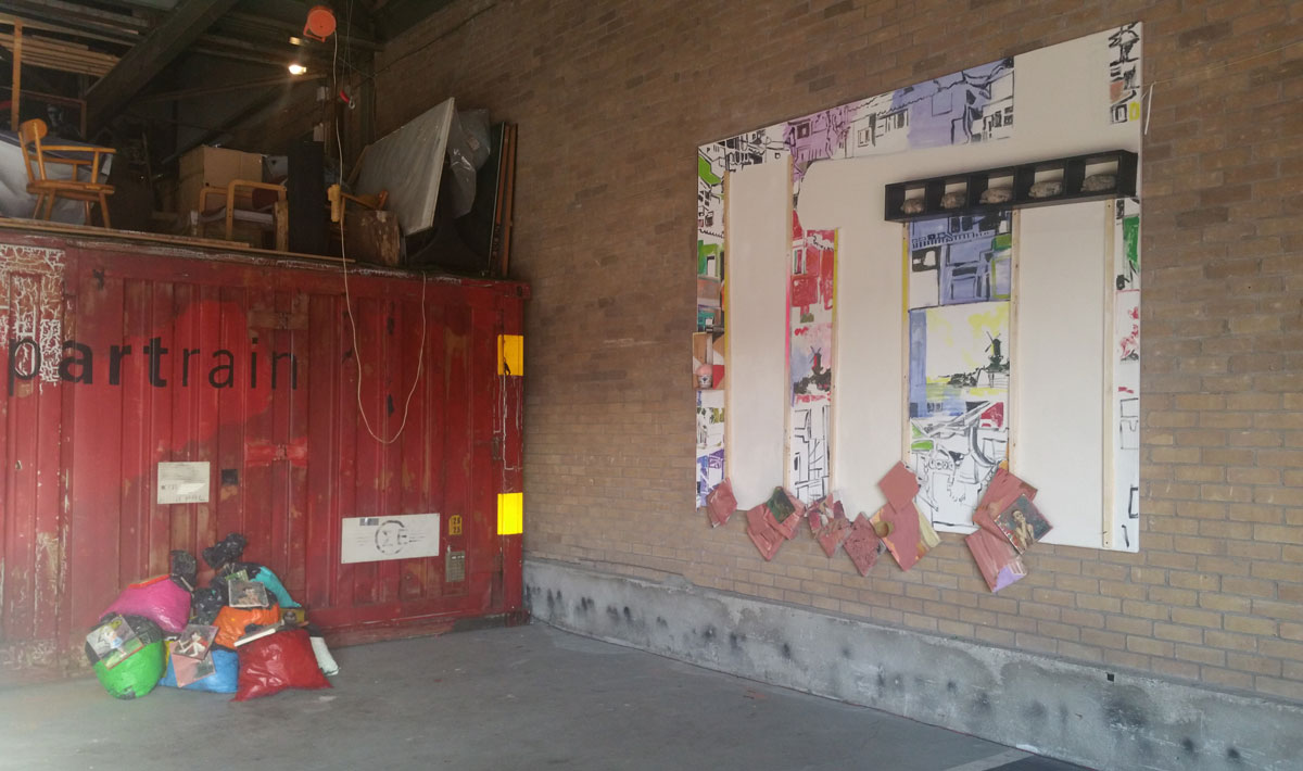 Bij deze expositie wilde ik het schilderij laten opgaan in de rommelige omgeving.