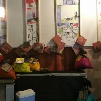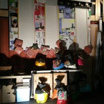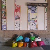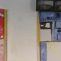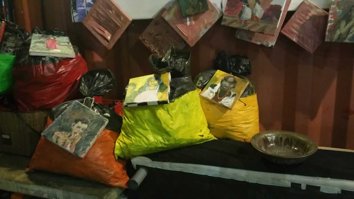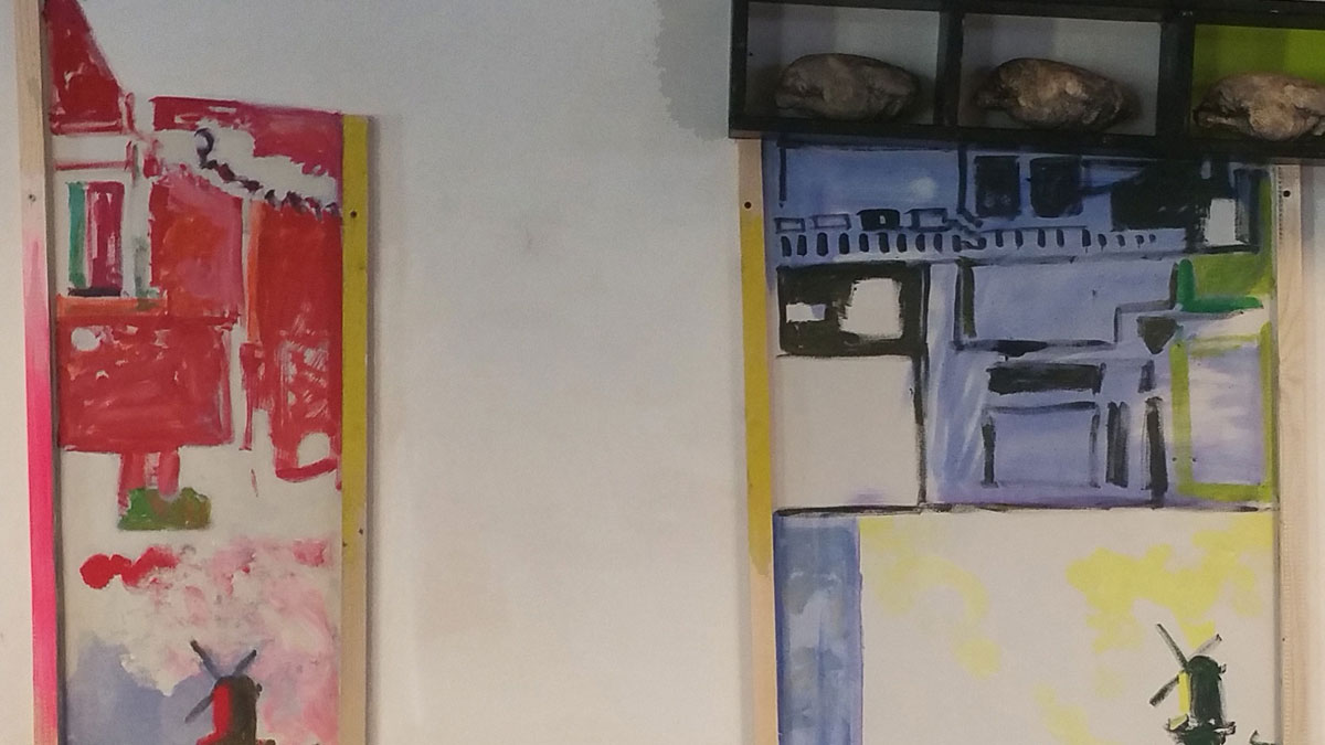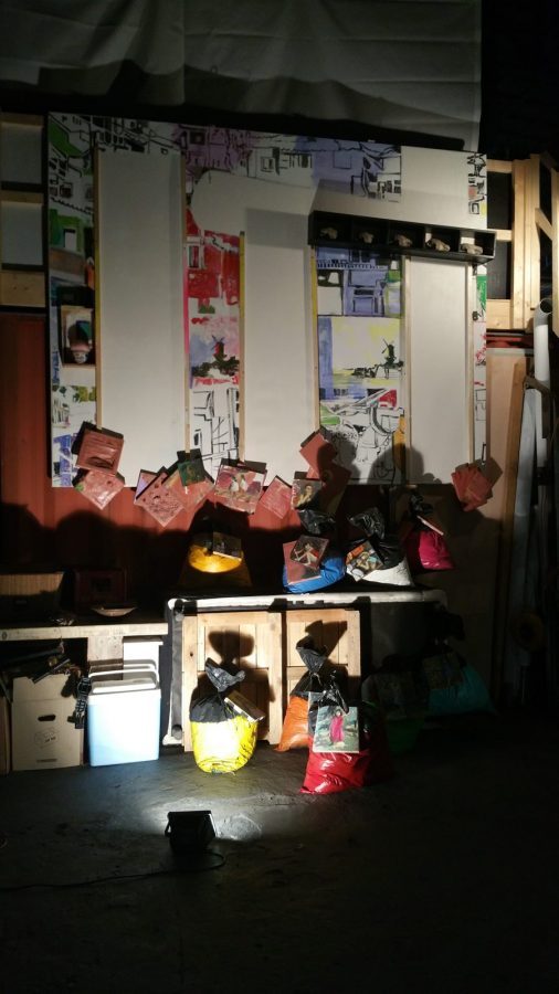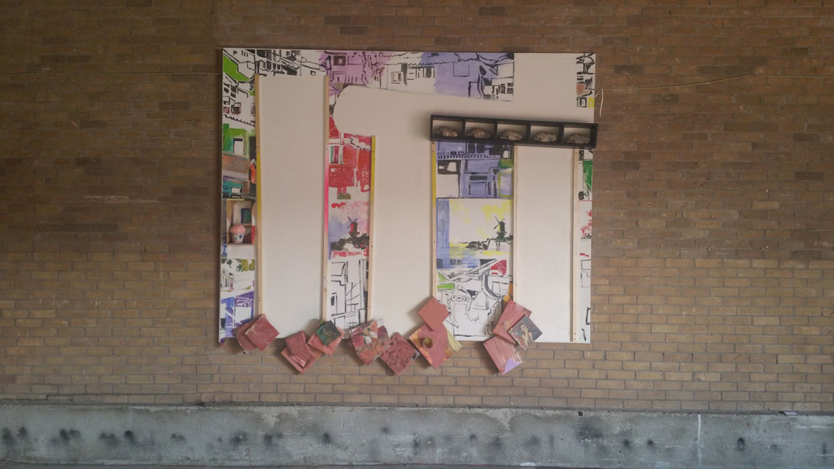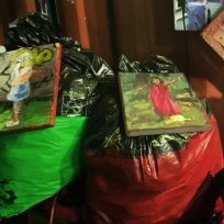 Bij deze expositie wilde ik het schilderij laten opgaan in de rommelige omgeving.