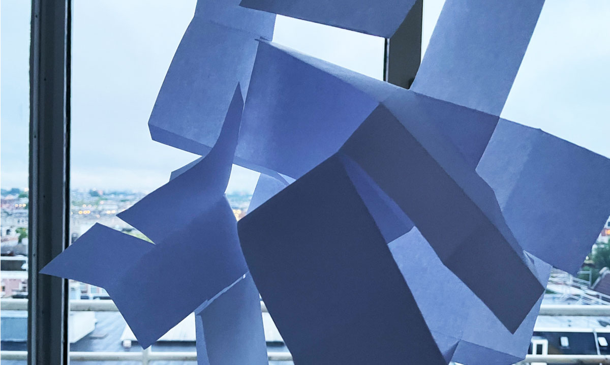 Zelfs als een verhuisdoos platgemaakt is zijn de stukken nog herkenbaar: de ovale gaten zijn onmiskenbaar de handgrepen. In een gordijn geregen van allerlei ijzerwaren herkent men voorwerpen die herinneringen oproepen aan ooit bewoonde kamers en tijdelijke werkplekken. De kleine voorwerpen vormen een blikvullende sculptuur die een verbinding aangaat met het gebouw en de andere kunstwerken. Geïnspireerd door abstracte kunststromingen uit de vorige eeuw maakt Berloth haar eigen, minder strenge, minimalistische kunstwerken.
