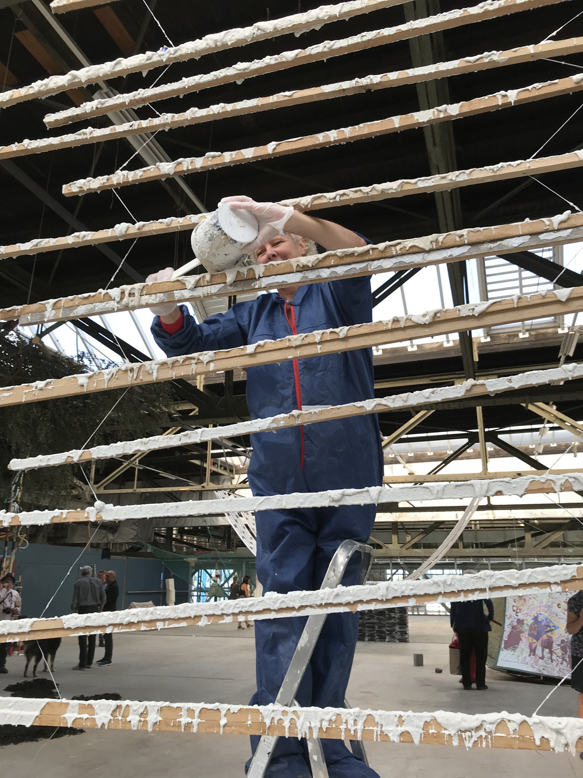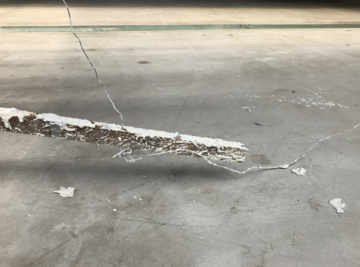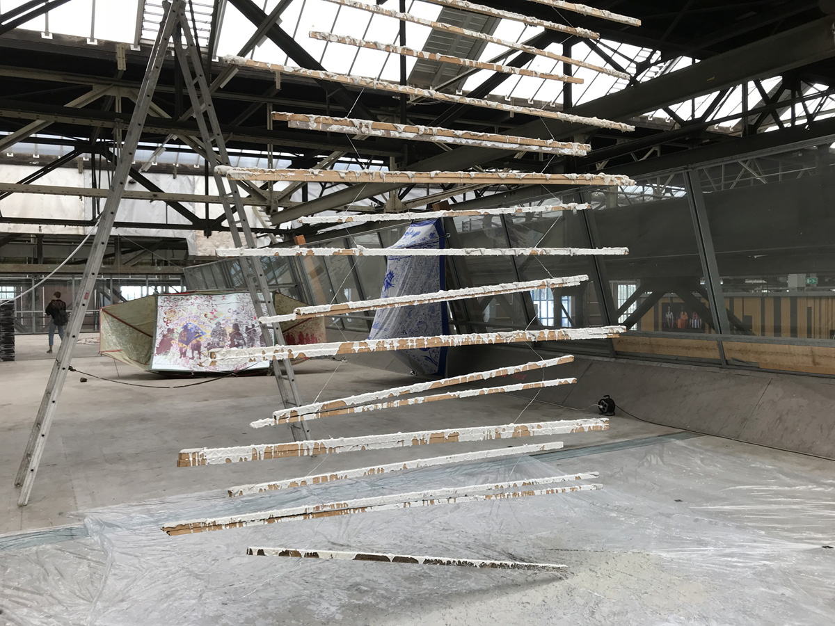 Horizontal slats mirror the steel beams of the roof. The slats divide the space in a front and back side. One side of the installation is covered in a thick layer of gyprock and paint. Where it has solidified it gets interesting.