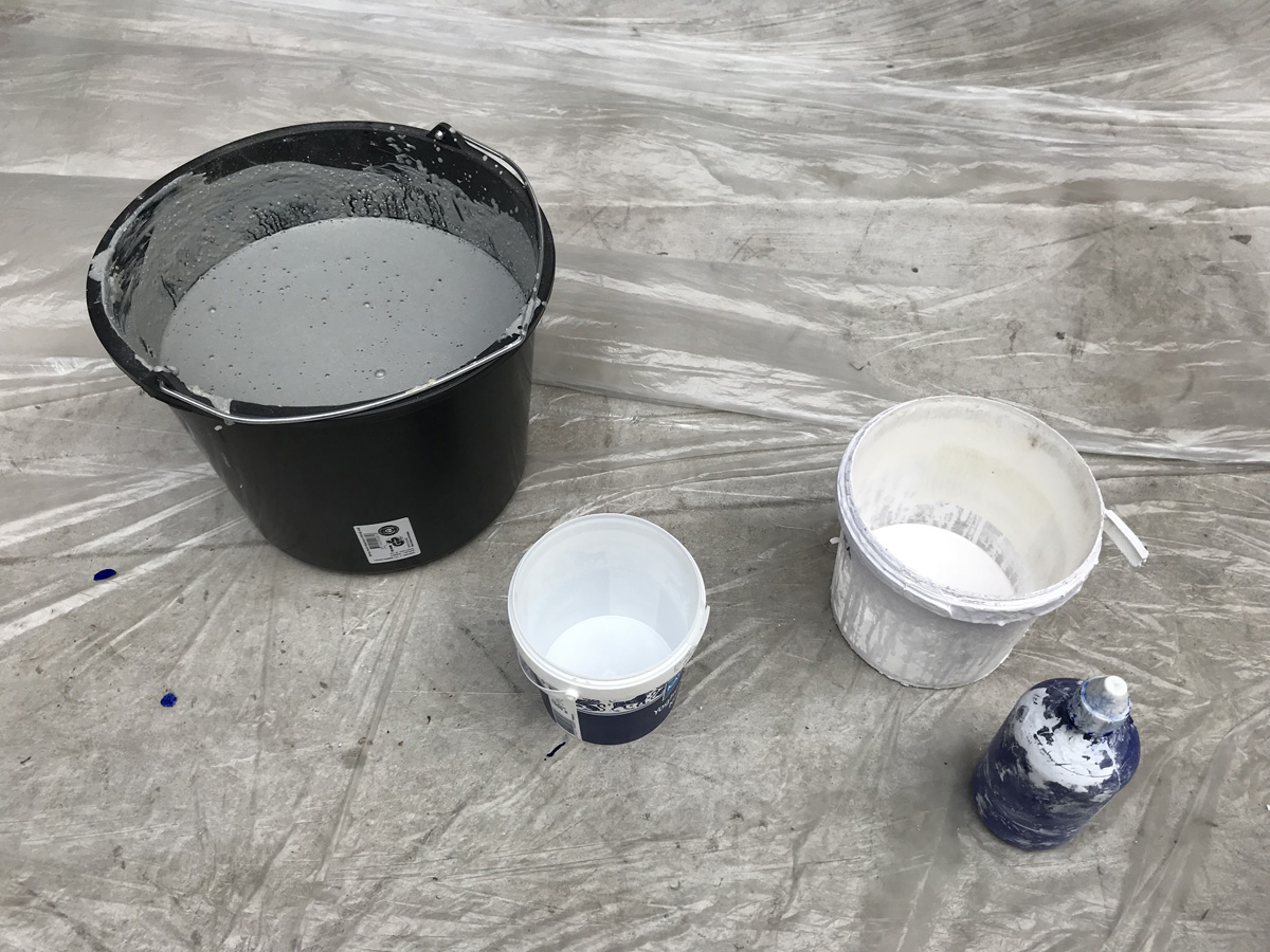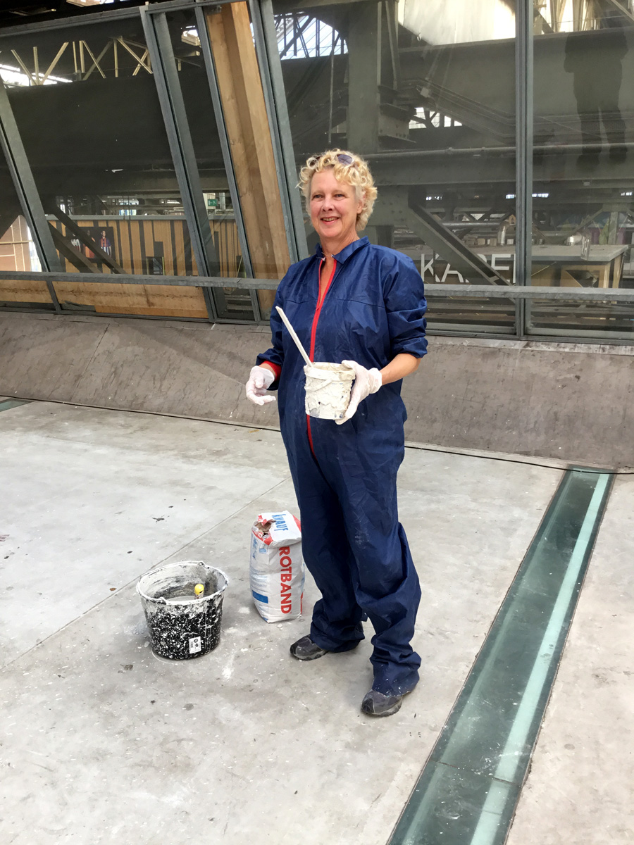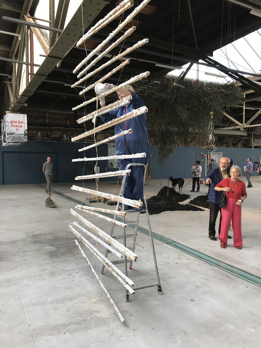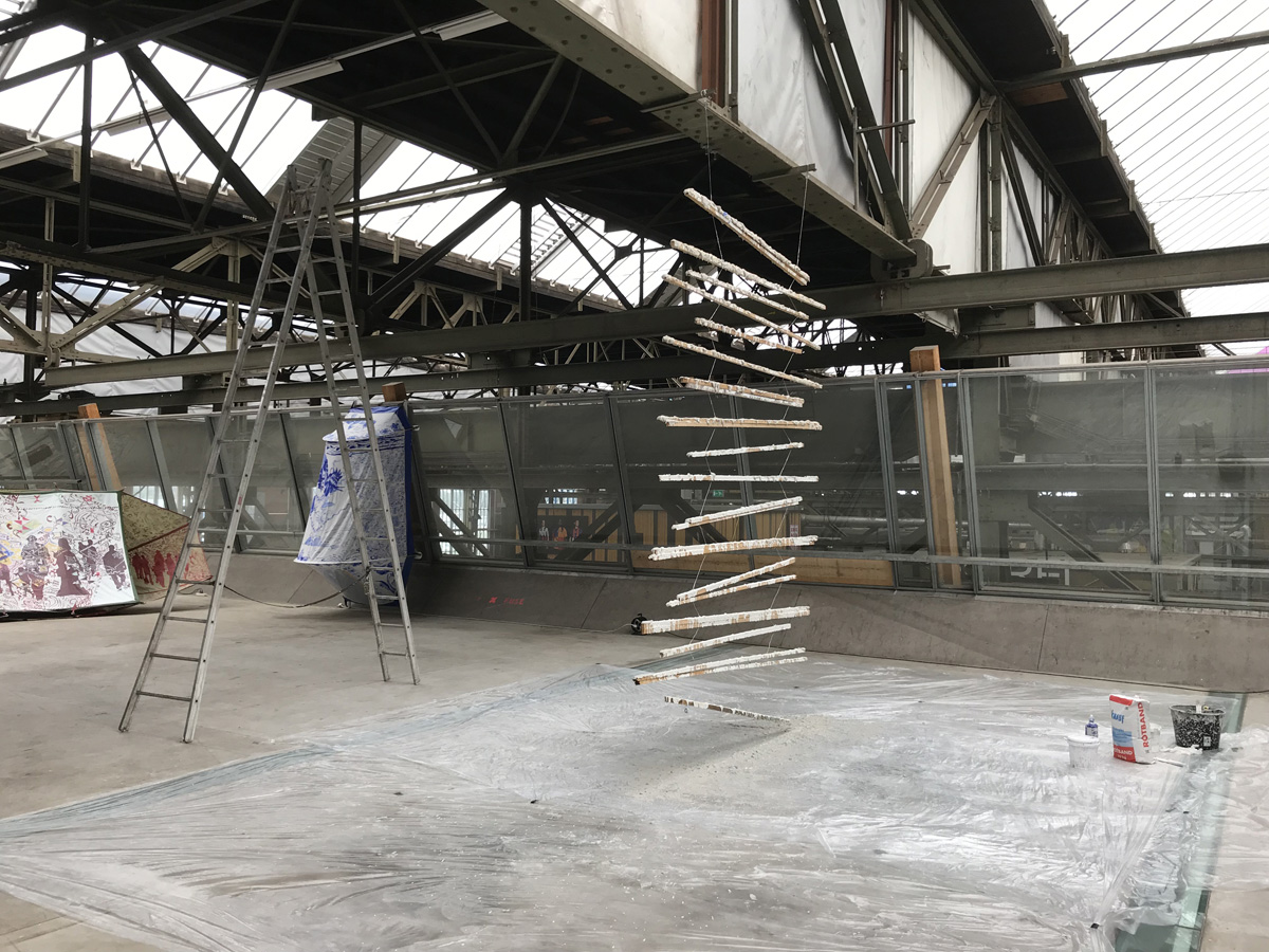Horizontal slats mirror the steel beams of the roof. The slats divide the space in a front and back side. One side of the installation is covered in a thick layer of gyprock and paint. Where it has solidified it gets interesting.