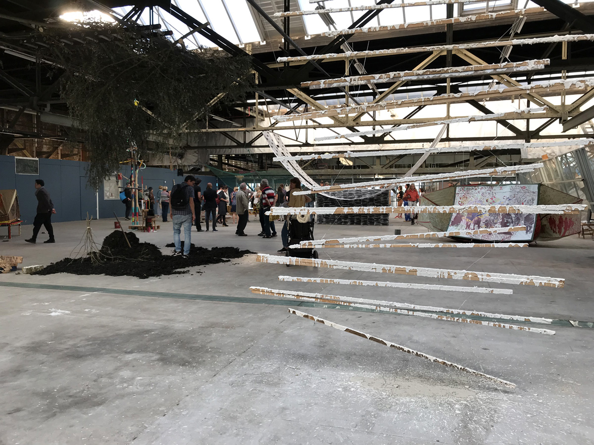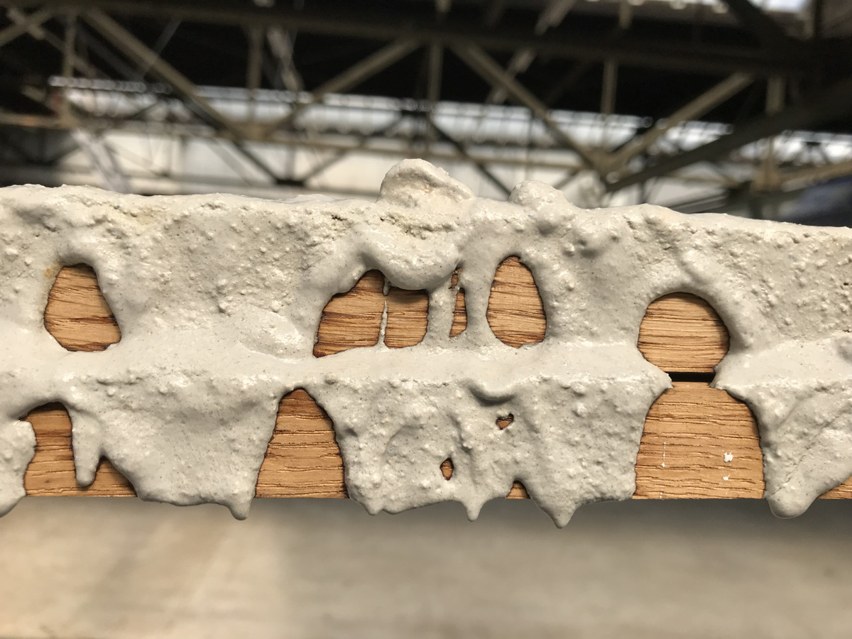 Horizontale latten die corresponderen met de stalen dakconstructie. Ze verdelen de ruimte in ervoor en erachter. Eén zijde van de installatie is bedekt met een dikke laag gips en verf. Daar waar het gestold is wordt het interessant.