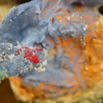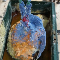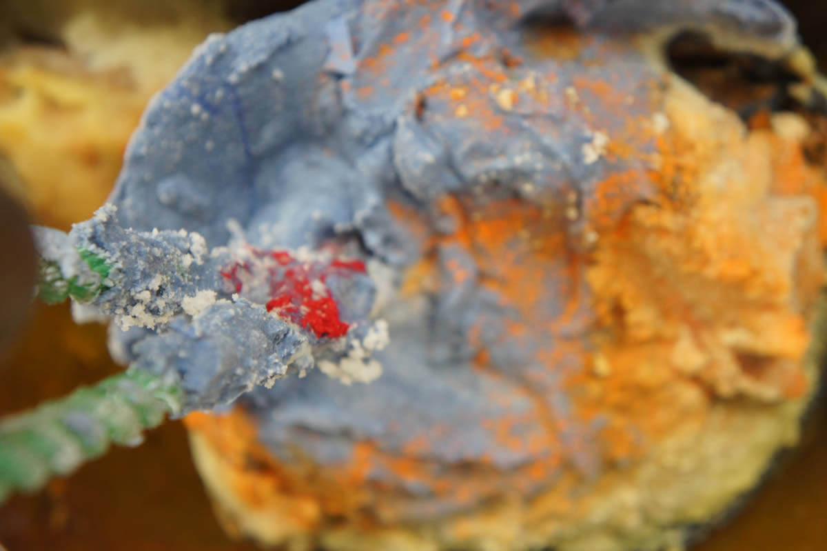 Langzaam wordt er een verbinding tot stand gebracht door het zout op de wollen draad.