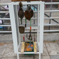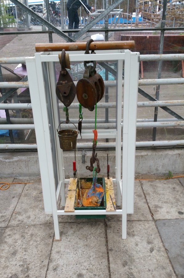 De kwetsbaarheid van het wollen draadje wordt benadrukt door de grote katrollen